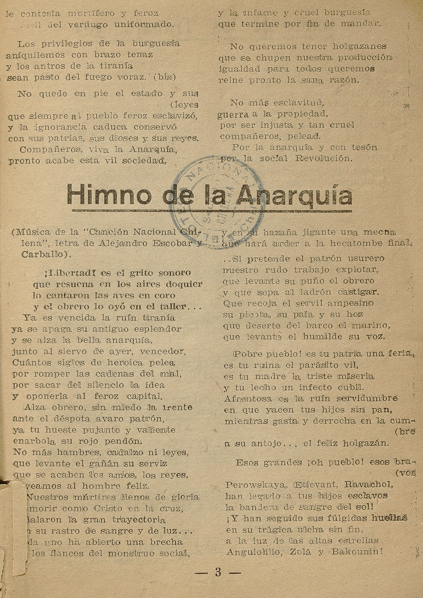 Himno de la Anarquía en Triviño, A. (Comp.). (1925). Cancionero revolucionario. Santiago: Editorial Lux.
